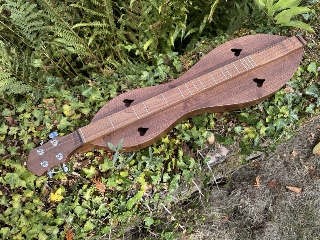 Standard full-size all-walnut body, bookmatched on back and sides.  Much lighter-coloured walnut top, also bookmatched.  Ginger-style smaller flat head and Gotoh tuners with small length of sloping fingerboard before composite ‘nut’ and zero fret (some distance from it).  Usual two layer, box-section fingerboard with 6+ and 13+ frets, “McSpadden” behind strum hollow, immediately in front of the heavily angled composite bridge.  Usual cross-grained string strainer on top of tail, recessed tail, stainless steel mushroom-headed string anchors and vent into body. Chrome strap buttons each end.  Overall length 35½”, upper bout 5¾”, lower bout 7″, depth 1⅞”, FBW 1⅜”, VSL 26″ (short/medium scale), weight 2lb 5oz (1051g).  Has a zero, 6+ and 13+ fret.  Original McSpadden string gauges (as recommended for short-scale dulcimers) 0.012/0.012, 0.016, 0.026w.