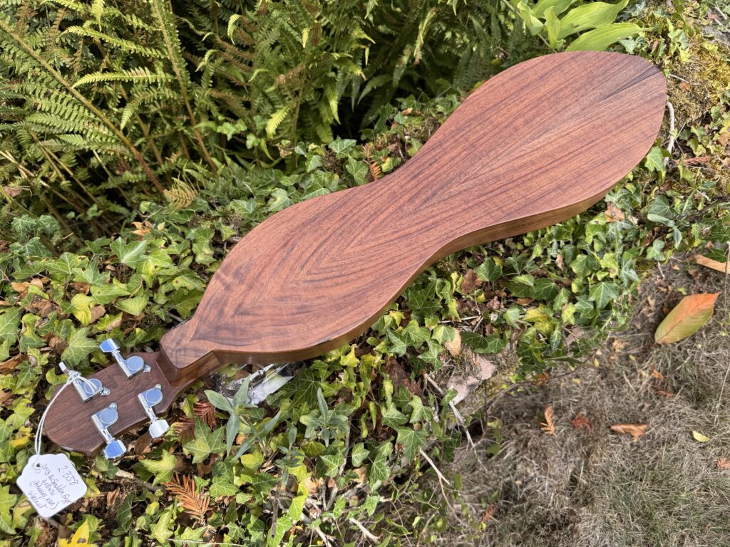Nicely figured solid wood cherry body, bookmatched on the back, with pink/ginger-coloured streaks.  Broad-grained redwood top with a pink tinge which complements the cherry body beautifully.  Usual two level McSpadden hollow fingerboard with 6+ and 13+ frets.  Composite bridge and ‘nut’ with zero fret.  Quality chrome Gotoh tuners and strap buttons.  Usual mushroom-headed pins as string anchors with cross-grain tail cap to take the strain of the string tension.  Has the usual heart soundholes, with tails pointing to the tail.  Overall length 35¾”, upper bout 5¾”, lower bout 7⅛”, depth 1⅞”, FBW 1½”, VSL 28⅜” (long/medium scale), weight 2lb 6oz (1079g).  Has a zero, 6+ and 13+ fret.  Strings now 0.010/0.010, 0.014, 0.023w phosphor bronze.